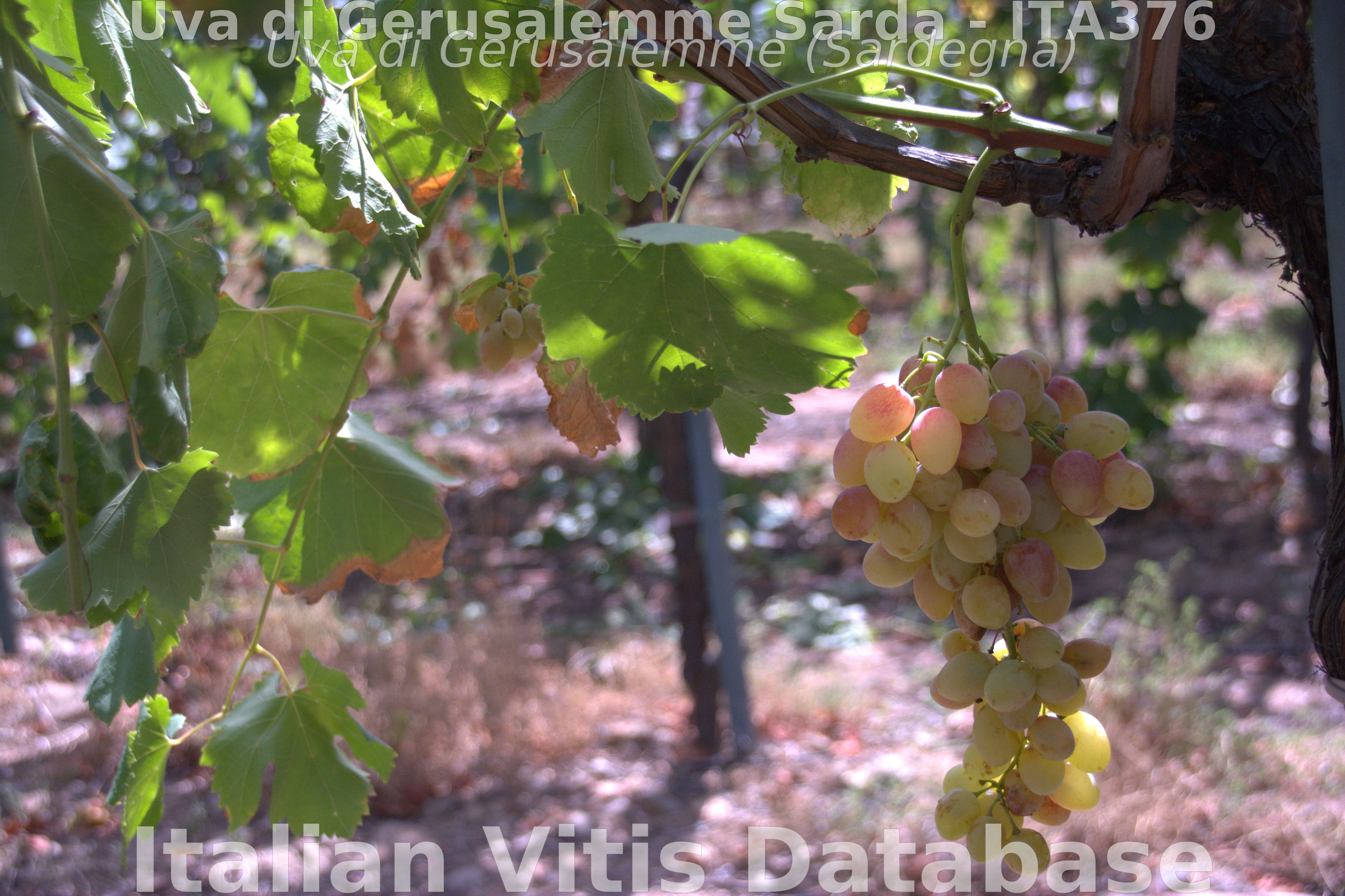Per questo vitigno è evidente il suo diretto rapporto con L’Uva Bianca di Serdiana 2 che corrisponde a Dattier de Beyrouth. E’ vicina anche a Reine de Vignes ma con una relazione meno stretta e peraltro Dattier de Beyrouth avrebbe dato origine per incrocio con Perle de Csaba (corrispondente alla nostra Lugnana) a Reine de Vignes (online resource 5, Lacombe et al., 2012). La vicinanza tra l’Uva di Gerusalemme e l’Uva Bianca di Serdiana 2 (Dattier de Beyrouth) è talmente elevata che si potrebbe ipotizzare un rapporto full-sib più che di discendenza.